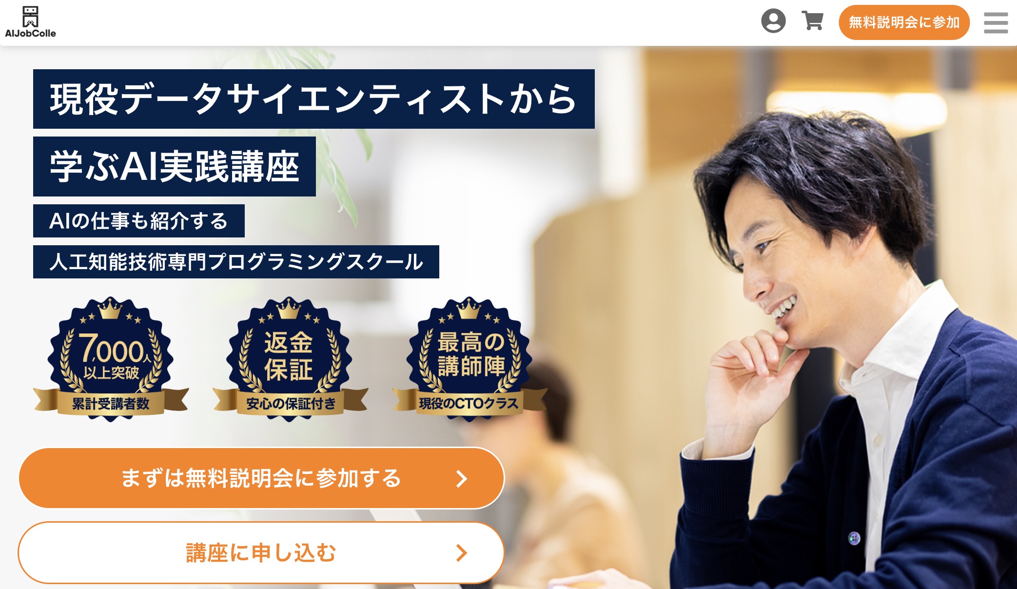 | 特徴 | データ分析からAI開発まで | 初心者向けの講座 | AIを基礎から学べる | 機械学習に必要な数学が学習できる | 未経験から短期間でAIスキルを身に付けれる | サービス開始3ヵ月で会員数は1万人を突破 | ワークショップ型の研修感覚で学習できる | 月額3,040円から始められるコスパ最強 | 機械学習エンジニアを目指せる | AI構築に必要な機械学習やディープラーニングを学習 | Pythonプログラムの作り方について学習 | 基礎学習からプロダクト開発までを学習 |