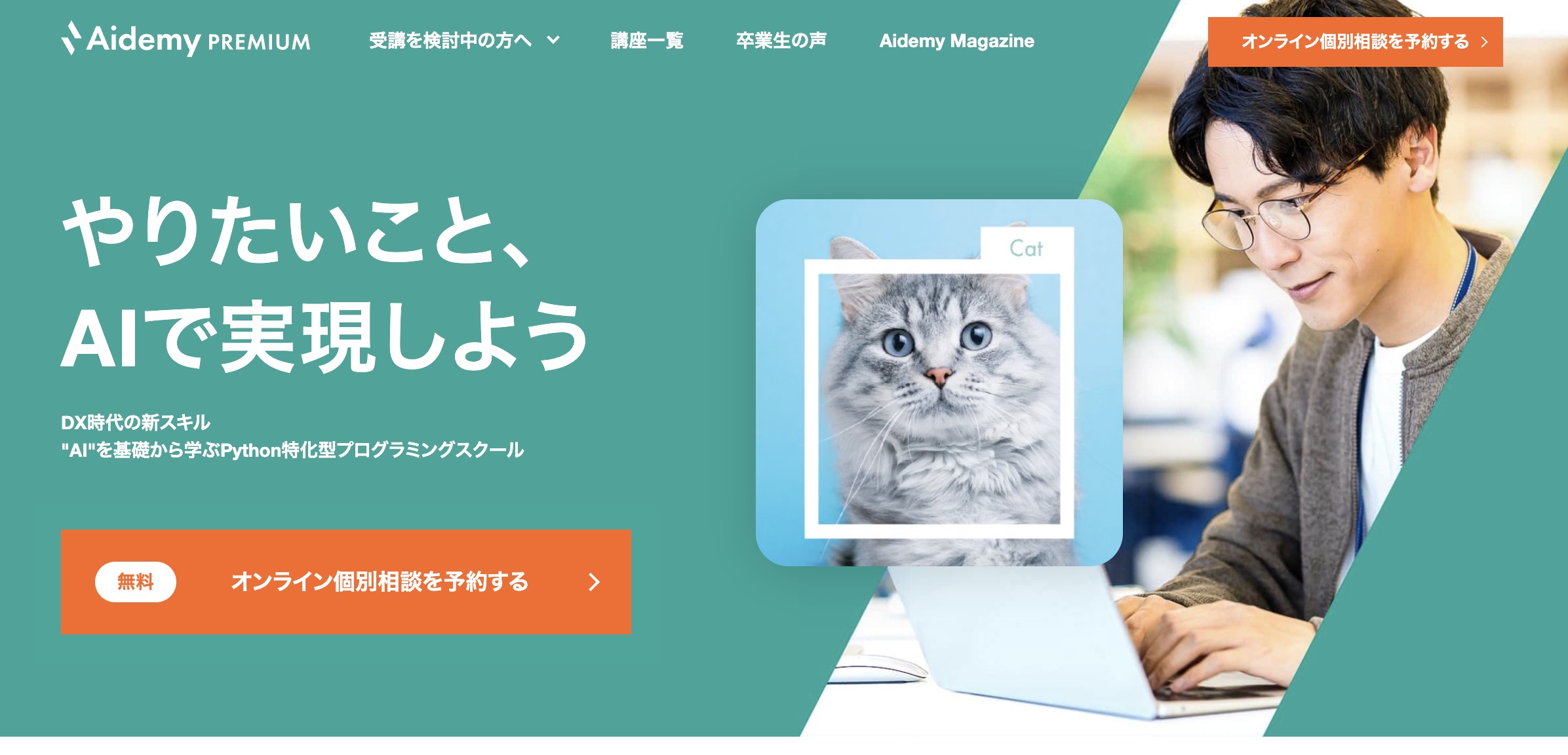 Aidemy Premiumは、”AI”を基礎から学ぶPython特化型プログラミングスクールです。
