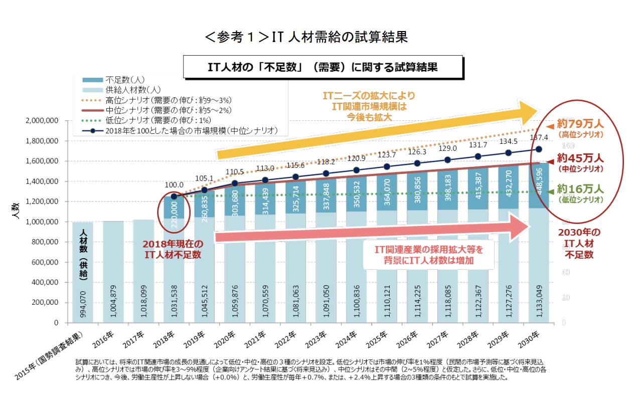 経済産業省のIT人材需給に関する調査によると2030年までに79万人ものエンジニア不足が起きることが明らかになっています。