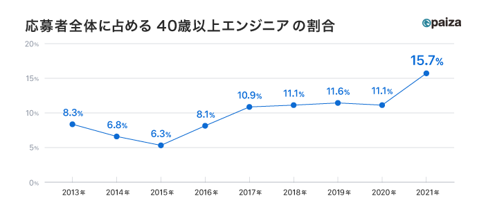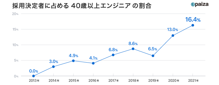 上記にともない、近年では40代以上の方でエンジニアとして採用される方が増えています。下記のグラフをご覧ください。