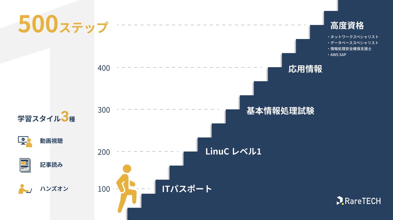 RareTECHの特徴の一つが500ステップカリキュラムと呼ばれる学習方法です。希少なエンジニアになるために必要な学習内容を500に分けて、初心者でも理解しやすいものからステップアップして学べます。