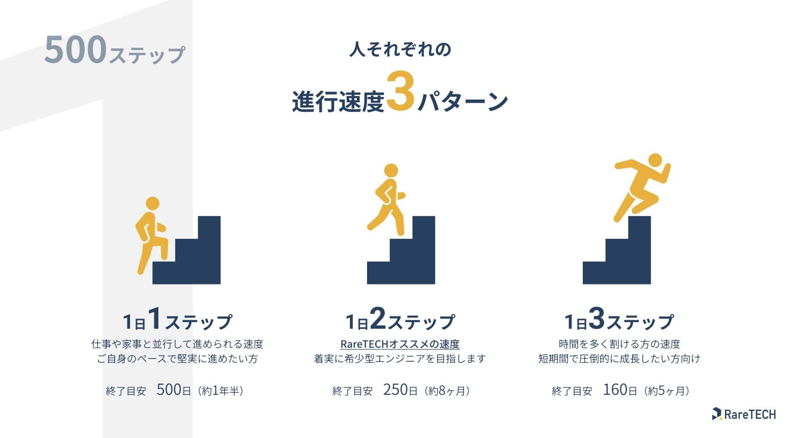 また、RareTECHでは学習スピードに関して厳密な制限はありません。時間を多く避ける方なら1日3ステップ、家族や事後との時間がある中で学習を進めるなら1日1ステップといったように、ライフスタイルに合わせて学習スピードを調整できます。