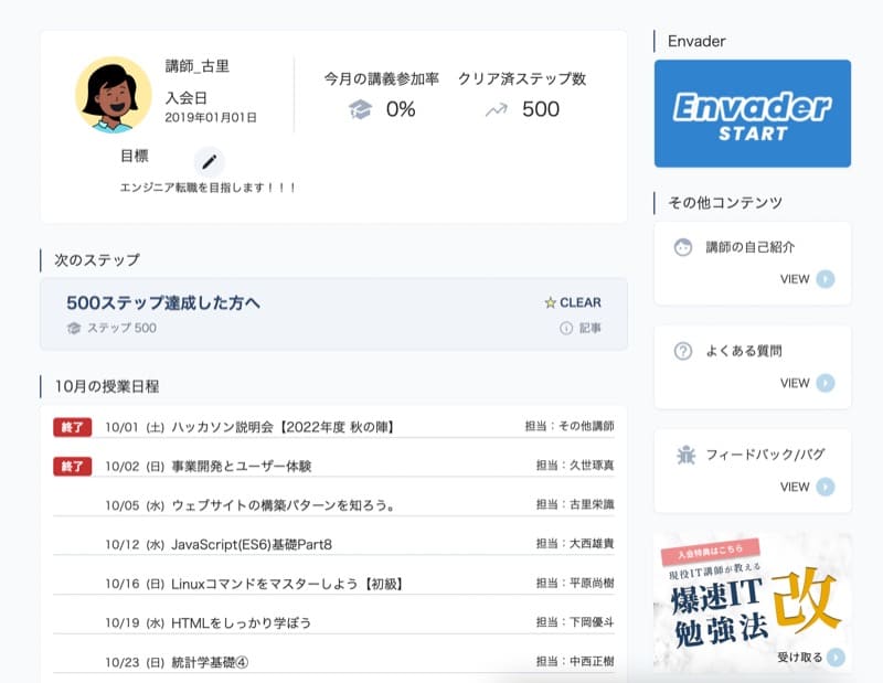講義以外のタイミングで質問できるチャットサービスや、オンライン学習サービス「Envader」の利用など、希少型エンジニアによる講義以外にも、さまざまなサービスがあるため、有効活用していきましょう。