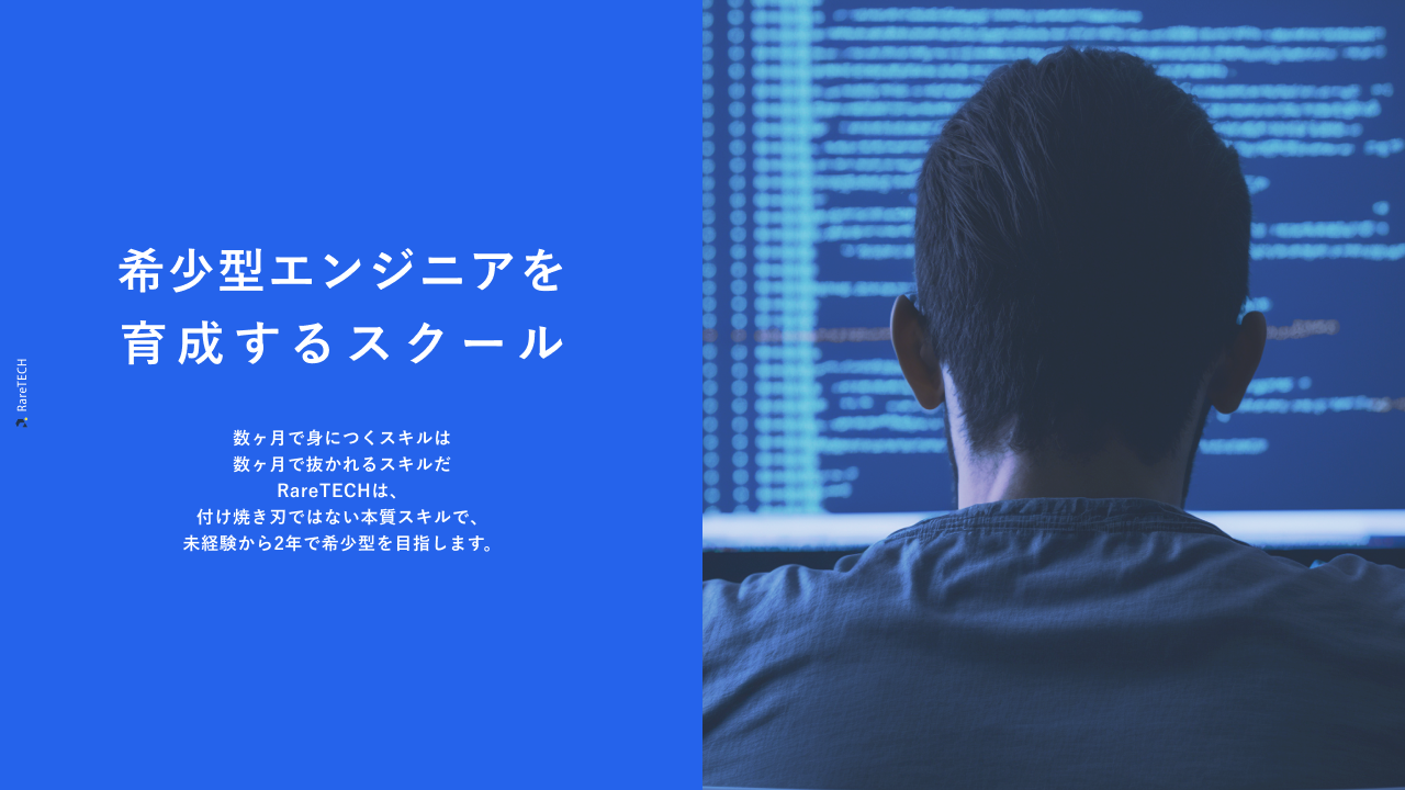 RareTECHは、世界的な企業で活躍したり、自分で課題を解決できたりする希少型エンジニアを目指せるプログラミングスクールです。