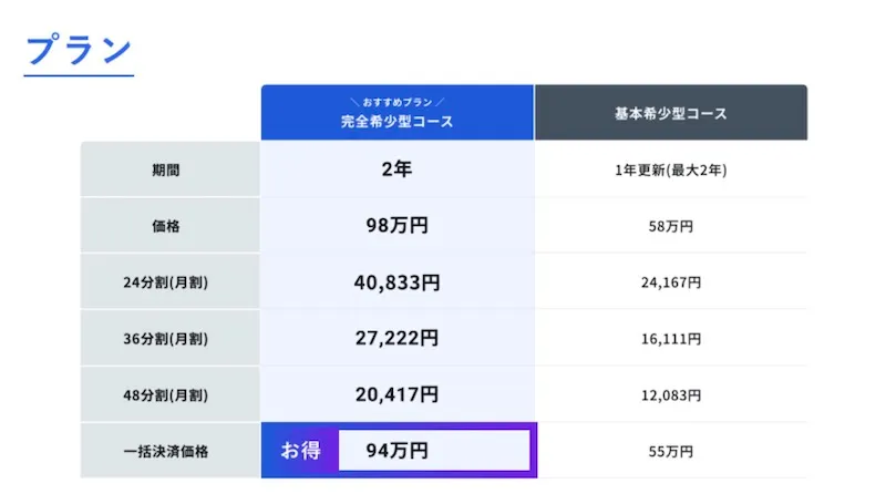 しかし、RareTECHの場合、月払い、年払いから支払い方法を選べます。一度に高額の料金を払うのが難しい方は、月払いにして、月々の負担額を抑えると良いでしょう。