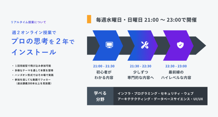 講義が行われるのは毎週水曜日・日曜日の21:00〜23:00。講義は、希少エンジニアとして現役で働いている講師が、それぞれの専門分野について講義してくれるオムニバス形式です。