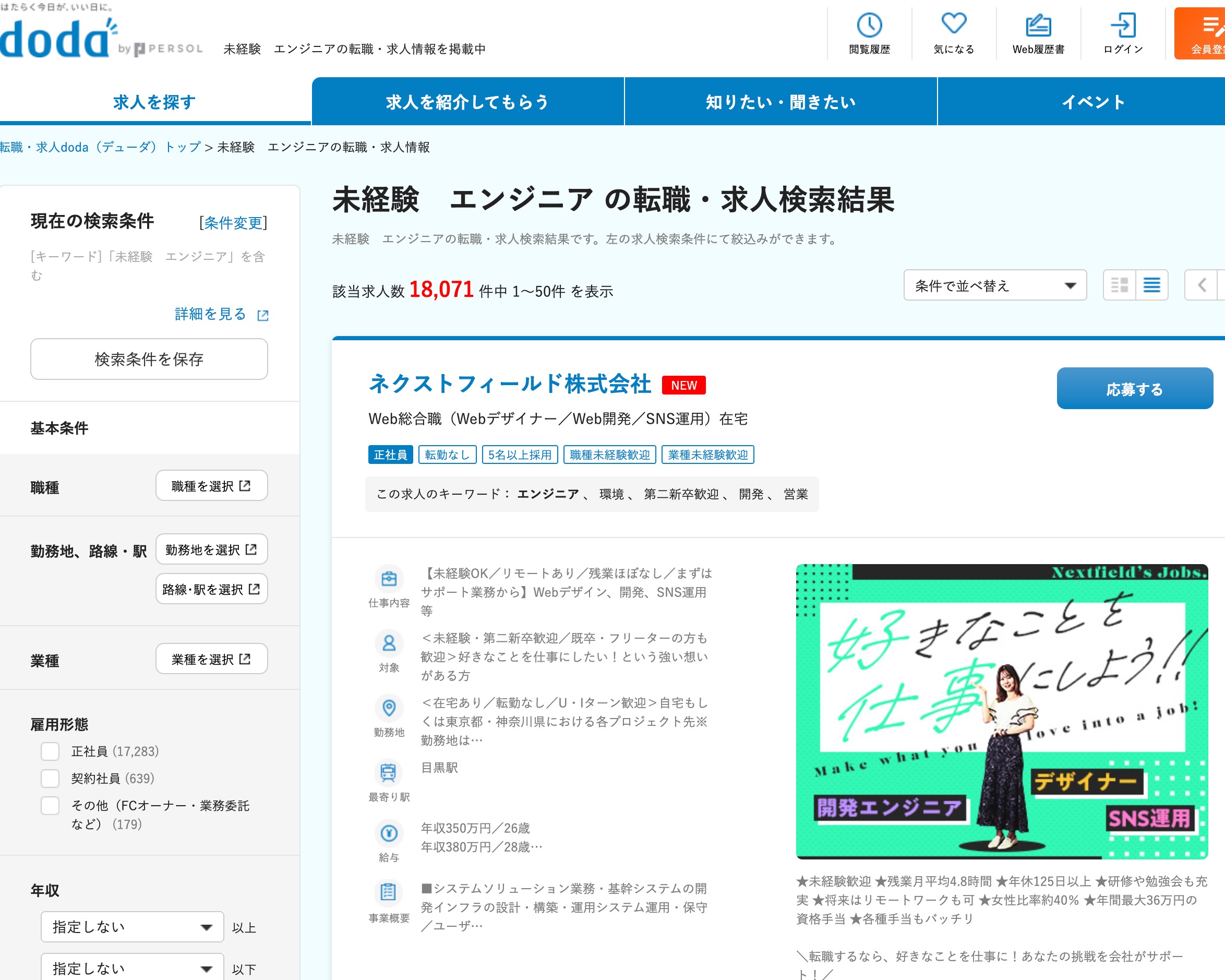 DODAのWebサイトで「未経験 エンジニア」を検索すると多くの求人が表示されます。