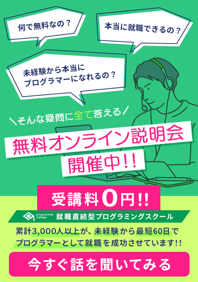 - 受講料無料でエンジニアを目指せるプログラマカレッジに申し込む