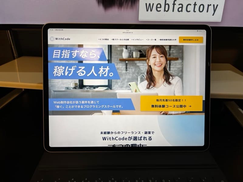 WithCodeは、最安値5万円以下でエンジニアへの道が開けるプログラミングスクールです。同業他社と比べてもローコストで受講できるため、「お金はかけられないけれど、プログラミングは学びたい」という方にぴったりなスクールです。